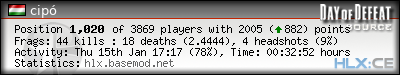 | Rank | Server | Kills | % | Ratio | Deaths | K:D | Headshots | Percentage of Headshots | % | HS:K |