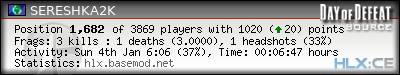 | Rank | Map | Kills | % | Ratio | Deaths | % | Ratio | K:D | Headshots | % | Ratio | HS:K |