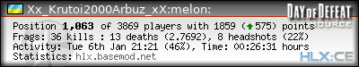 | Rank | Server | Kills | % | Ratio | Deaths | K:D | Headshots | Percentage of Headshots | % | HS:K |
