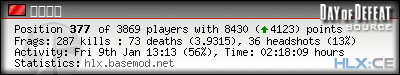 | Rank | Server | Kills | % | Ratio | Deaths | K:D | Headshots | Percentage of Headshots | % | HS:K |