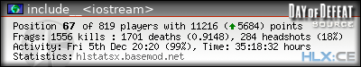 | Rank | Server | Kills | % | Ratio | Deaths | K:D | Headshots | Percentage of Headshots | % | HS:K |