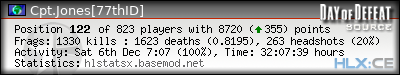| Rank | Server | Kills | % | Ratio | Deaths | K:D | Headshots | Percentage of Headshots | % | HS:K |