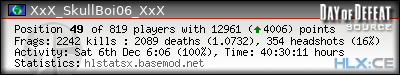 | Rank | Server | Kills | % | Ratio | Deaths | K:D | Headshots | Percentage of Headshots | % | HS:K |