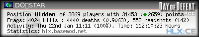 | Rank | Server | Kills | % | Ratio | Deaths | K:D | Headshots | Percentage of Headshots | % | HS:K |