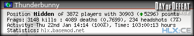 | Rank | Victim | Kills | % | Ratio | Deaths | % | Ratio | K:D | Headshots | % | Ratio | HS:K |