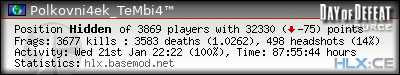 | Rank | Server | Kills | % | Ratio | Deaths | K:D | Headshots | Percentage of Headshots | % | HS:K |
