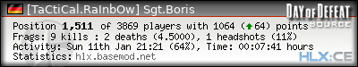 | Rank | Map | Kills | % | Ratio | Deaths | % | Ratio | K:D | Headshots | % | Ratio | HS:K |