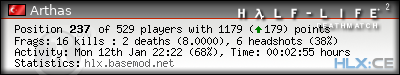 | Rank | Server | Kills | % | Ratio | Deaths | K:D | Headshots | Percentage of Headshots | % | HS:K |