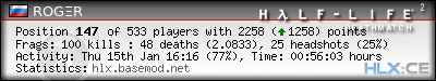 | Rank | Server | Kills | % | Ratio | Deaths | K:D | Headshots | Percentage of Headshots | % | HS:K |