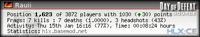 | Rank | Map | Kills | % | Ratio | Deaths | % | Ratio | K:D | Headshots | % | Ratio | HS:K |