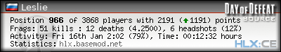| Rank | Server | Kills | % | Ratio | Deaths | K:D | Headshots | Percentage of Headshots | % | HS:K |