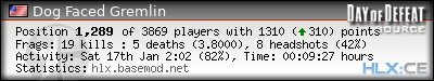 | Rank | Server | Kills | % | Ratio | Deaths | K:D | Headshots | Percentage of Headshots | % | HS:K |