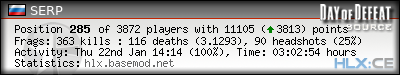 | Rank | Server | Kills | % | Ratio | Deaths | K:D | Headshots | Percentage of Headshots | % | HS:K |