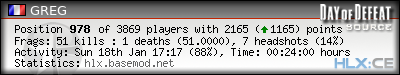 | Rank | Server | Kills | % | Ratio | Deaths | K:D | Headshots | Percentage of Headshots | % | HS:K |