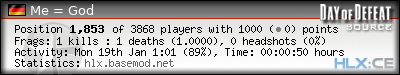| Rank | Map | Kills | % | Ratio | Deaths | % | Ratio | K:D | Headshots | % | Ratio | HS:K |