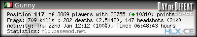 | Rank | Server | Kills | % | Ratio | Deaths | K:D | Headshots | Percentage of Headshots | % | HS:K |