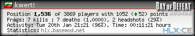 | Rank | Map | Kills | % | Ratio | Deaths | % | Ratio | K:D | Headshots | % | Ratio | HS:K |