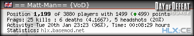 | Rank | Map | Kills | % | Ratio | Deaths | % | Ratio | K:D | Headshots | % | Ratio | HS:K |