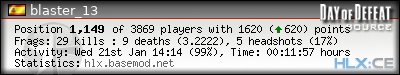 | Rank | Server | Kills | % | Ratio | Deaths | K:D | Headshots | Percentage of Headshots | % | HS:K |
