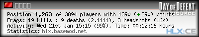 | Rank | Server | Kills | % | Ratio | Deaths | K:D | Headshots | Percentage of Headshots | % | HS:K |
