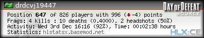 | Rank | Map | Kills | % | Ratio | Deaths | % | Ratio | K:D | Headshots | % | Ratio | HS:K |