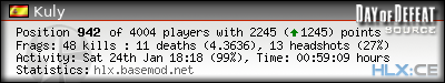 | Rank | Server | Kills | % | Ratio | Deaths | K:D | Headshots | Percentage of Headshots | % | HS:K |