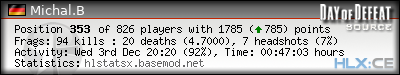 | Rank | Server | Kills | % | Ratio | Deaths | K:D | Headshots | Percentage of Headshots | % | HS:K |