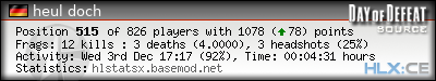 | Rank | Server | Kills | % | Ratio | Deaths | K:D | Headshots | Percentage of Headshots | % | HS:K |