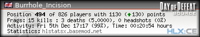 | Rank | Server | Kills | % | Ratio | Deaths | K:D | Headshots | Percentage of Headshots | % | HS:K |