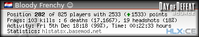 | Rank | Server | Kills | % | Ratio | Deaths | K:D | Headshots | Percentage of Headshots | % | HS:K |