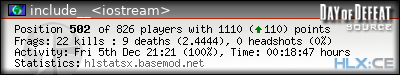 | Rank | Server | Kills | % | Ratio | Deaths | K:D | Headshots | Percentage of Headshots | % | HS:K |