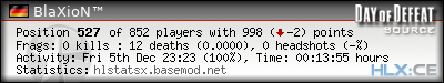 | Rank | Server | Kills | % | Ratio | Deaths | K:D | Headshots | Percentage of Headshots | % | HS:K |