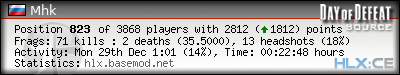 | Rank | Server | Kills | % | Ratio | Deaths | K:D | Headshots | Percentage of Headshots | % | HS:K |