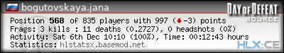 | Rank | Map | Kills | % | Ratio | Deaths | % | Ratio | K:D | Headshots | % | Ratio | HS:K |