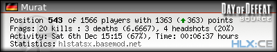 | Rank | Map | Kills | % | Ratio | Deaths | % | Ratio | K:D | Headshots | % | Ratio | HS:K |