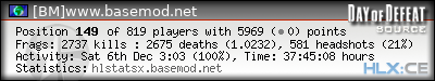 | Rank | Server | Kills | % | Ratio | Deaths | K:D | Headshots | Percentage of Headshots | % | HS:K |