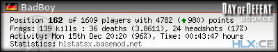 | Rank | Server | Kills | % | Ratio | Deaths | K:D | Headshots | Percentage of Headshots | % | HS:K |