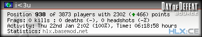 | Rank | Name | Time | Last Use | Kills | Deaths | K:D | Headshots | HS:K | Suicides | Accuracy |