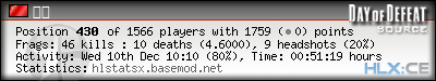 | Rank | Server | Kills | % | Ratio | Deaths | K:D | Headshots | Percentage of Headshots | % | HS:K |