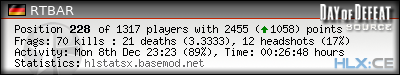 | Rank | Server | Kills | % | Ratio | Deaths | K:D | Headshots | Percentage of Headshots | % | HS:K |