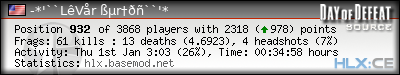 | Rank | Server | Kills | % | Ratio | Deaths | K:D | Headshots | Percentage of Headshots | % | HS:K |